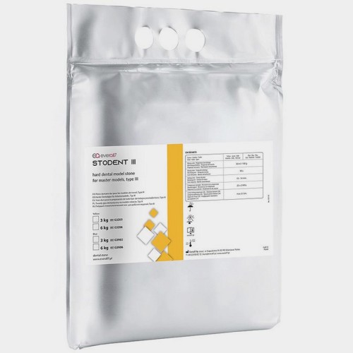 Stodent 3 это моделирующий гипс 3-го класса, рекомендованный для антагонистических и рабочих моделей при изготовлении съемных и бюгельных протезов. Преимущества Гладкая поверхность Облегчение изготовления моделей благодаря высокой тиксотропности Высокая устойчивость к излому во время снятия слепка Низкий уровень линейного расширения Хорошие механические свойства Характеристики Класс: 3 Цвет: жёлтый Масса: 3 кг Пропорции смешивания: 50 мл / 100 г Время смешивания (в вакууме): 30 сек Время ручного смешивания: 60 — 90 сек Время схватывания: 10 -14 мин Время извлечения модели: 45 мин Устойчивость на сжатие (после 1 ч*): 25 ± 2 MPa [> 20* Мпа] Линейное расширение (после 2 ч*) макс 0.15% [< 0.20*%]